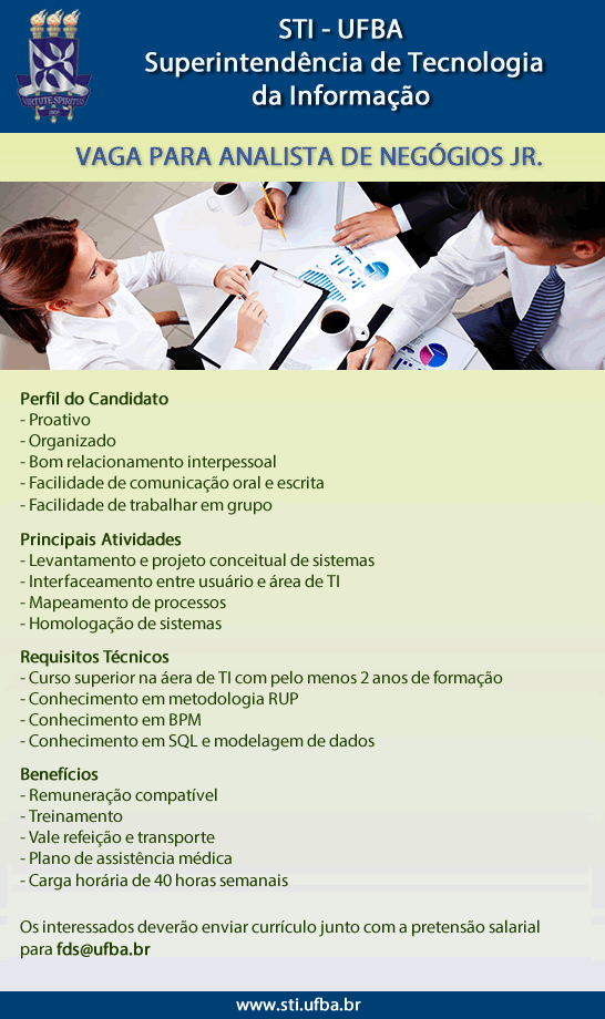 A STI busca candidato proativo, organizado e com bom relacionamento pessoal, entre outros atributos, para preencher vaga de Analista de Negócios Júnior. As missões técnicas e o trabalho em grupo, boa comunicação oral e escrita fazem parte dos requisitos. O banner apresenta mais detalhes, oportunidade para profissionais dinâmicos e motivados para trabalhar em equipe. Contratação imediata e vinculada ao período de manutenção do projeto.